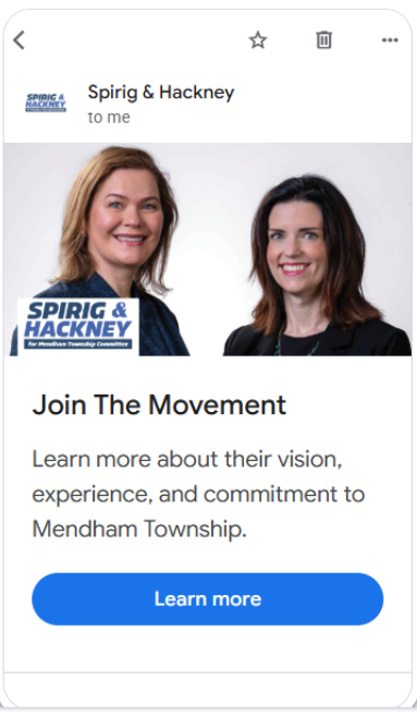 Lauren Spirig and Clare Hackney were running for the Mendham Township Committee in Brookside, NJ. They were mailing postcards with another marketing company and decided to switch over to PostcardMania to promote their political campaign.