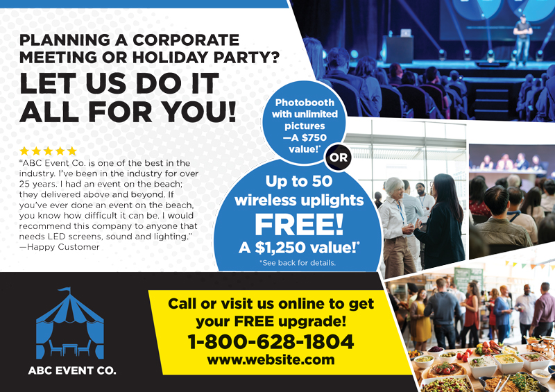 Event postcards are a powerful tool to boost your bookings and grow your event planning business. Navigating the event industry can be demanding, but teaming up with an event marketing expert takes the stress out of finding new clients and increasing your revenue.