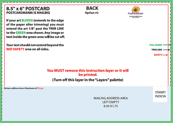 These postcard mailing templates (available for 11"x6", 8.5"x6" and 6"x4.25") include layout guides for front and back, including the mailing address area format. These templates are set up to accommodate the personalization options available with digital printing.